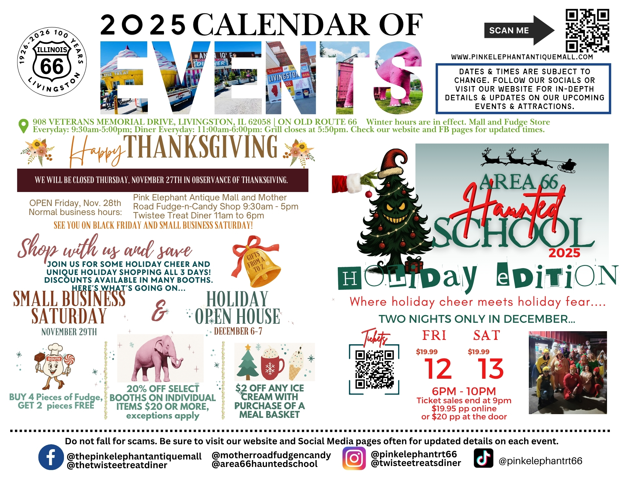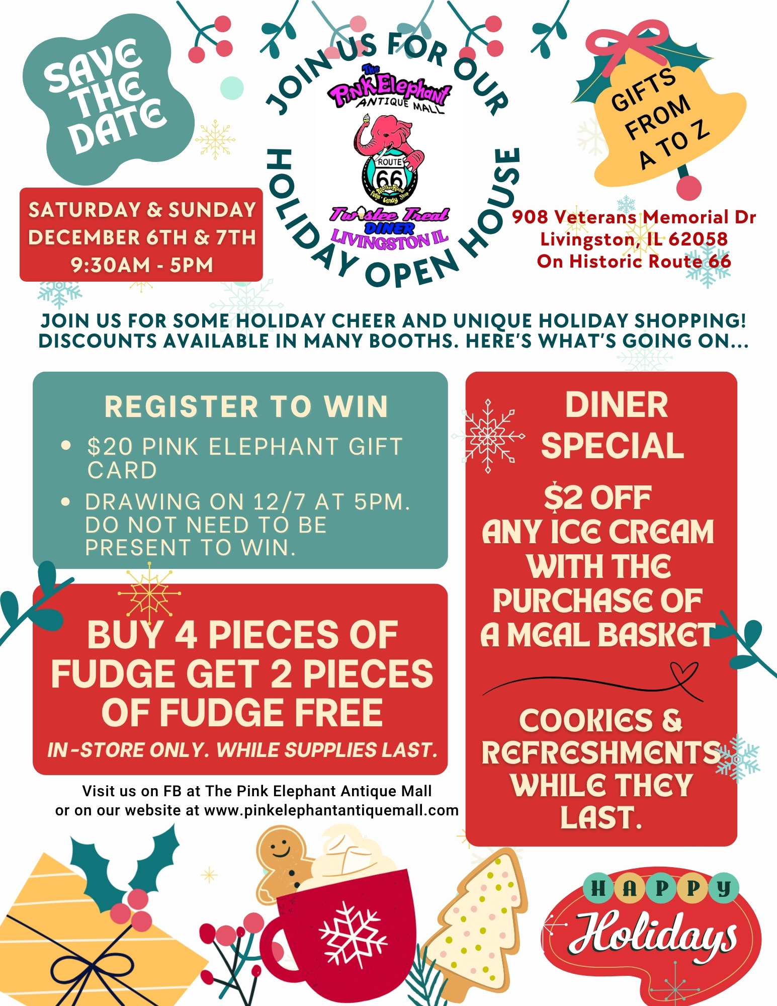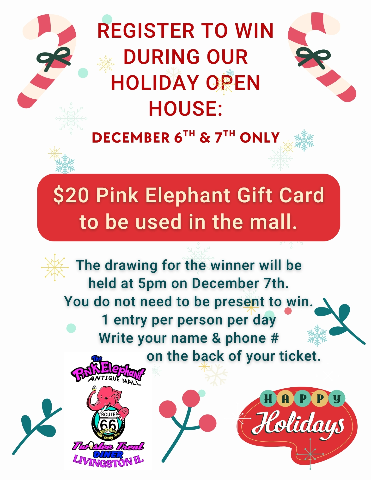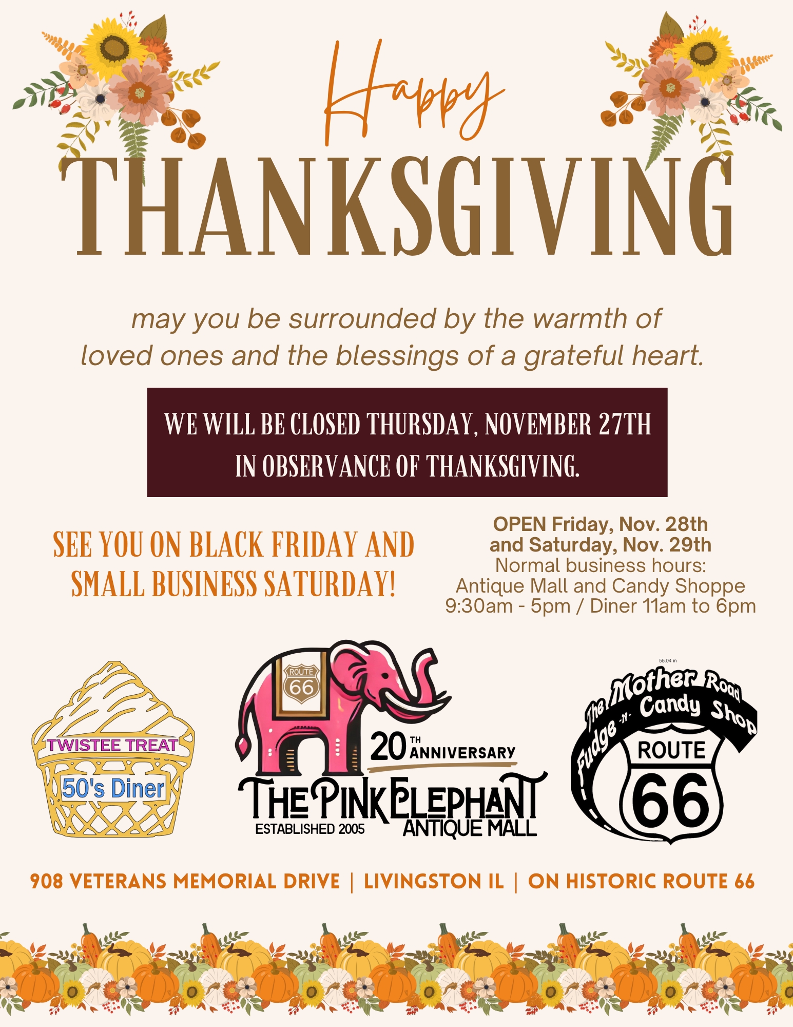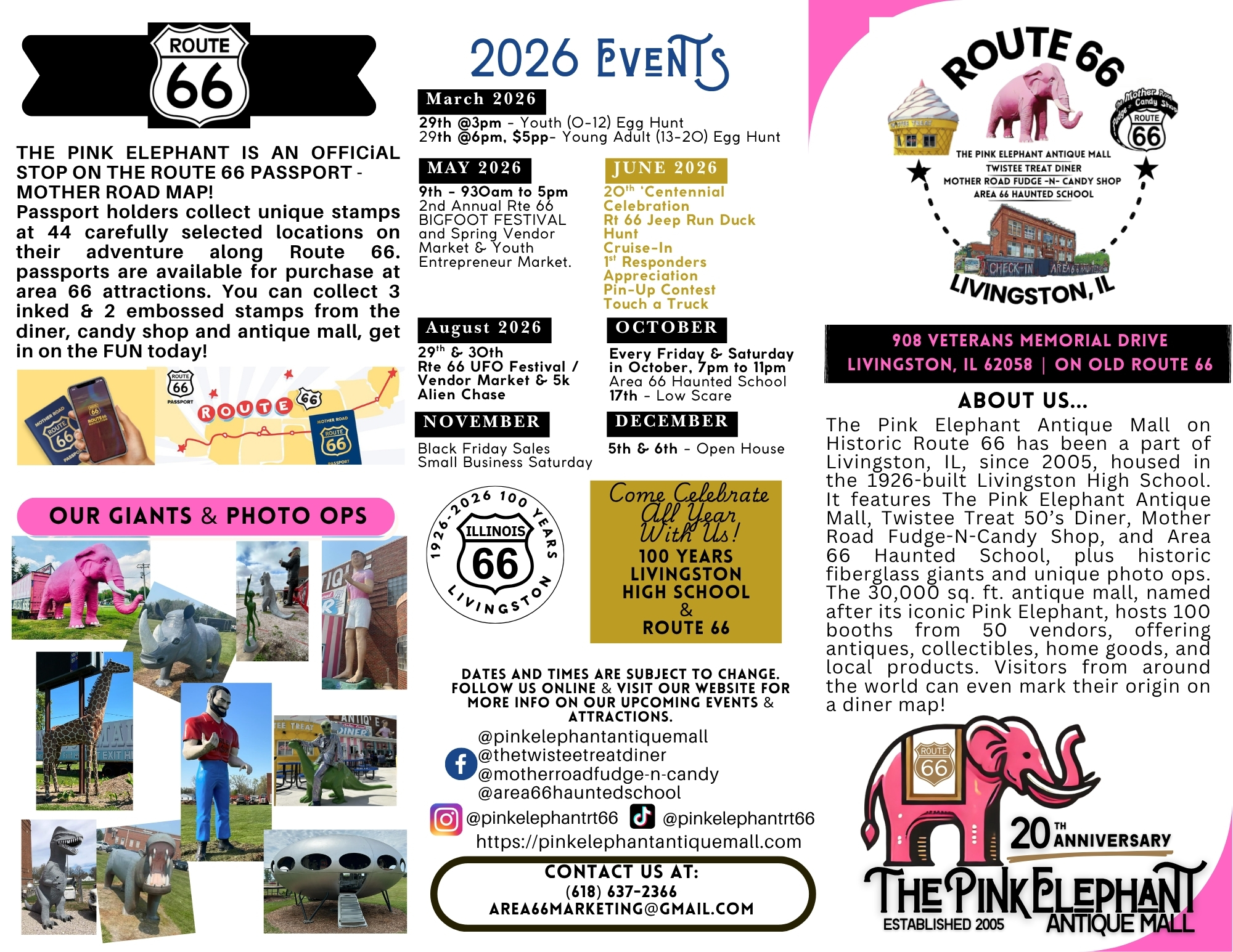 Howdy Y’all! We’re Tonia & Wayne Pickerill, proud owners of The Pink Elephant Antique Mall on Historic Route 66 in Livingston IL. This business has been a part of Livingston, IL since 2005. Our store is housed in the old Livingston IL high school, built in 1929. Today, it is a 30,000 square foot antique shopping mall, surrounded by historic fiberglass giants. The Pink Elephant is a favorite stop for those traveling Old Route 66. The mall has welcomed guests from all over the world, a map in the diner allows guests to place a pin for their place of origin. At Pink Elephant Antique Mall, we are passionate about supporting local vendors and offering a wide variety of antiques and items that appeal to all kinds of shoppers. The mall has everything from antique furniture, jewelry, collectibles, glassware, memorabilia, to candles, home goods and home decor. The mall also has two retro shops The Mother Road Fudge Factory and Candy Shop and The Twistee Treats Diner. The Mother Road Fudge Factory and Candy Shop is a 1950’s themed candy store that sells homemade fudge that is made on sight in a variety of flavors, caramelized roasted nuts made on sight, vintage candies, bulk candy, bulk salt water taffy, chocolates and Route 66 souvenirs. The Twistee Treats Diner is a kitschy 1950’s themed diner. The diner is in an original Twistee Treats ice cream cone shaped building with the dining area decked out in a hot pink tile floor. The Blues Brothers overlook the dining area and the jukebox. The diner serves a full menu for lunch and dinner including their burgers that are made with fresh local beef that is never frozen. The ice cream is amazing including soft serve, hand scooped and a large selection of specialties. The Pink Elephant is located right off of interstate I-55 40 minutes from St Louis, MO and less than an hour from Springfield IL. Come out to The Pink Elephant Antique Mall if you are looking for a memorable adventure. You will be glad you did. You can find us at 908 Veterans Memorial Dr in Livingston, IL 62058, or give us a call at (618) 637-2366. We look forward to welcoming you to our store!