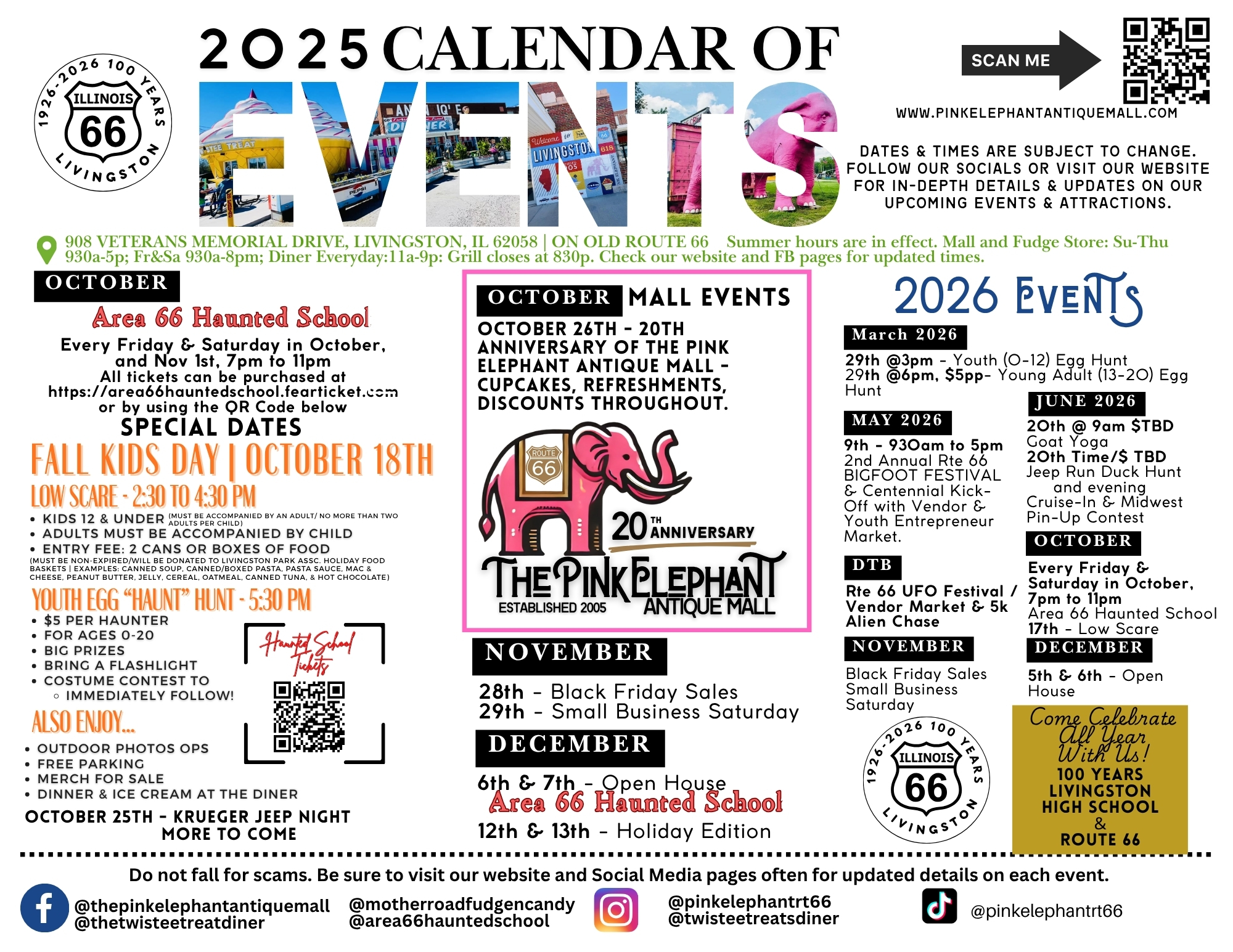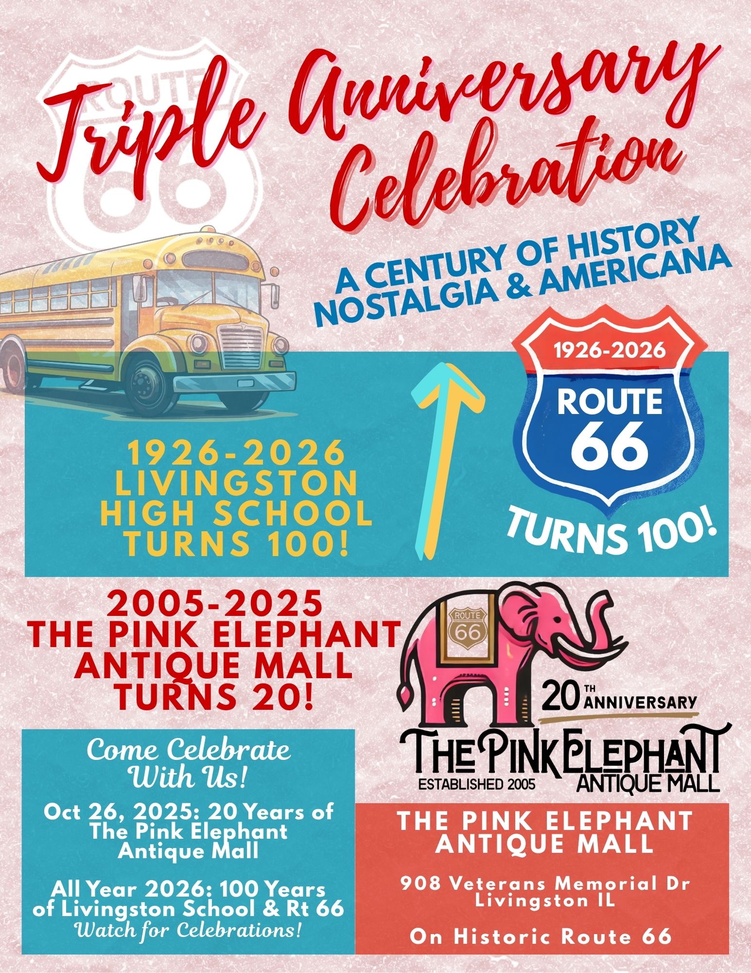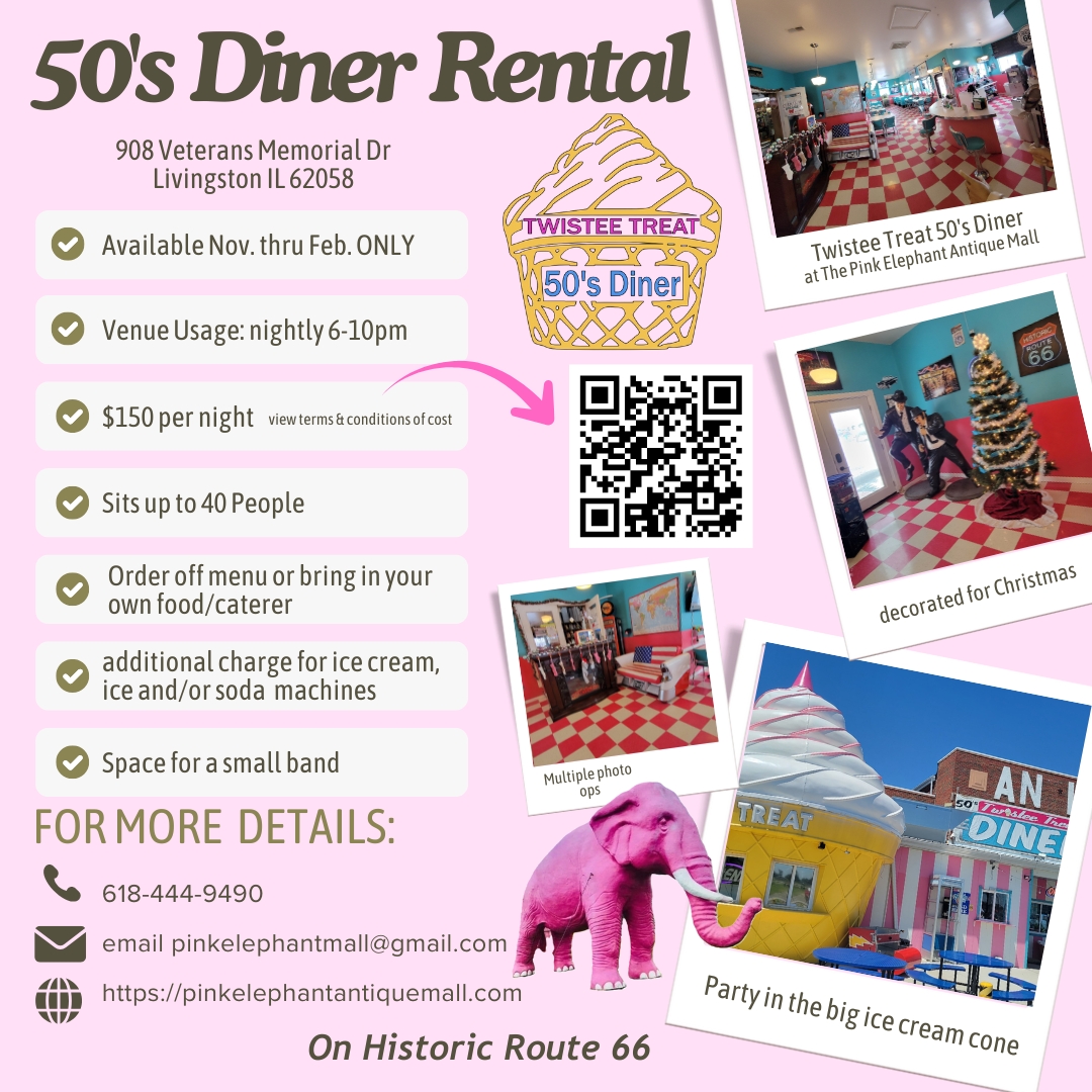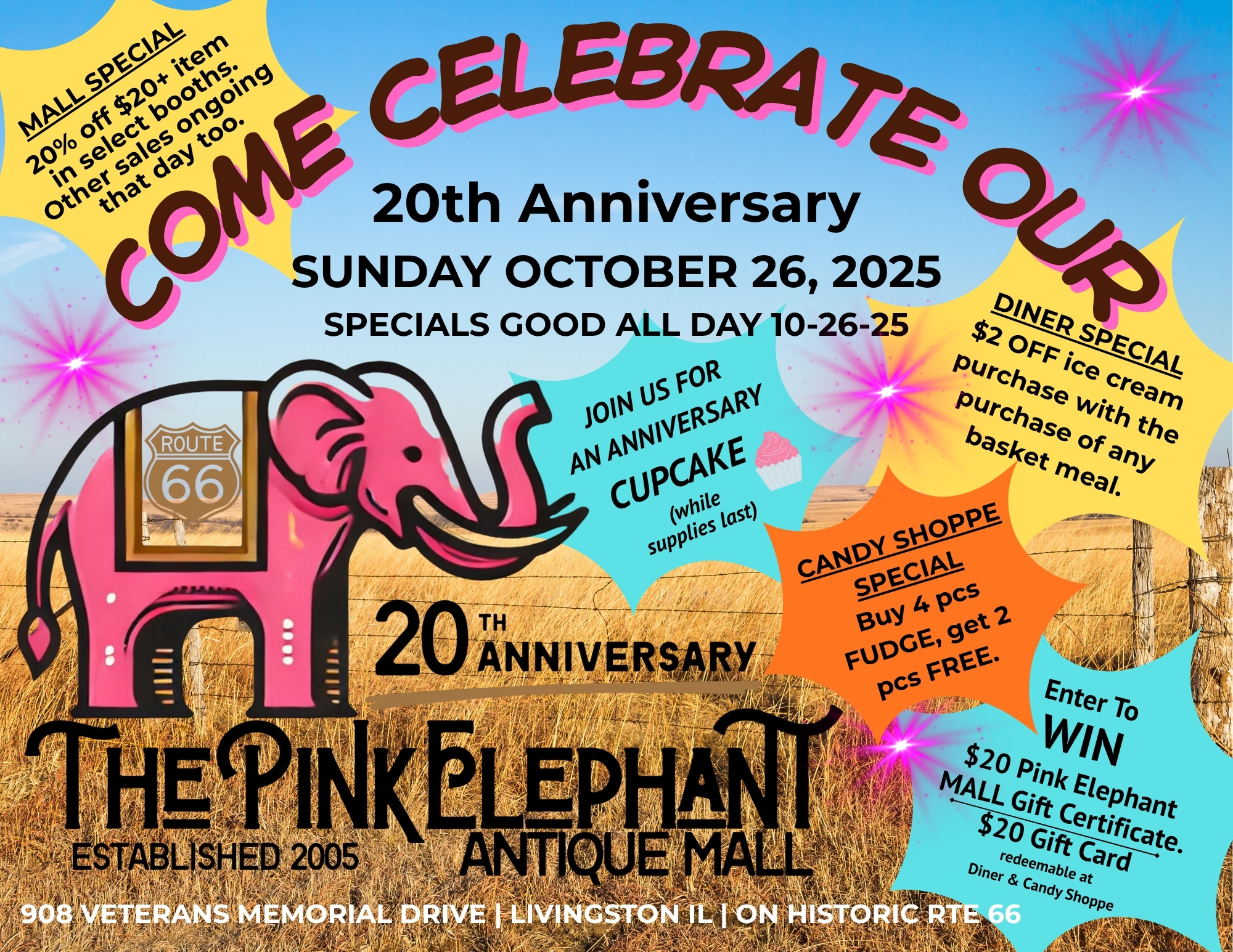 Howdy Y’all! We’re Tonia & Wayne Pickerill, proud owners of The Pink Elephant Antique Mall on Historic Route 66 in Livingston IL. This business has been a part of Livingston, IL since 2005. Our store is housed in the old Livingston IL high school, built in 1929. Today, it is a 30,000 square foot antique shopping mall, surrounded by historic fiberglass giants. The Pink Elephant is a favorite stop for those traveling Old Route 66. The mall has welcomed guests from all over the world, a map in the diner allows guests to place a pin for their place of origin. At Pink Elephant Antique Mall, we are passionate about supporting local vendors and offering a wide variety of antiques and items that appeal to all kinds of shoppers. The mall has everything from antique furniture, jewelry, collectibles, glassware, memorabilia, to candles, home goods and home decor. The mall also has two retro shops The Mother Road Fudge Factory and Candy Shop and The Twistee Treats Diner. The Mother Road Fudge Factory and Candy Shop is a 1950’s themed candy store that sells homemade fudge that is made on sight in a variety of flavors, caramelized roasted nuts made on sight, vintage candies, bulk candy, bulk salt water taffy, chocolates and Route 66 souvenirs. The Twistee Treats Diner is a kitschy 1950’s themed diner. The diner is in an original Twistee Treats ice cream cone shaped building with the dining area decked out in a hot pink tile floor. The Blues Brothers overlook the dining area and the jukebox. The diner serves a full menu for lunch and dinner including their burgers that are made with fresh local beef that is never frozen. The ice cream is amazing including soft serve, hand scooped and a large selection of specialties. The Pink Elephant is located right off of interstate I-55 40 minutes from St Louis, MO and less than an hour from Springfield IL. Come out to The Pink Elephant Antique Mall if you are looking for a memorable adventure. You will be glad you did. You can find us at 908 Veterans Memorial Dr in Livingston, IL 62058, or give us a call at (618) 637-2366. We look forward to welcoming you to our store!