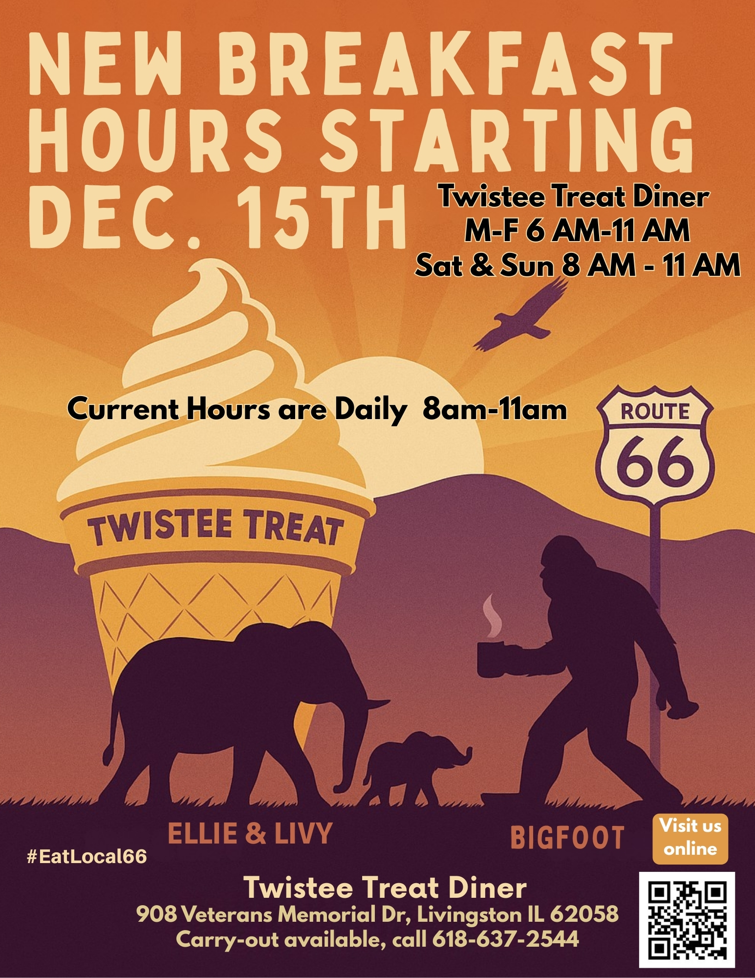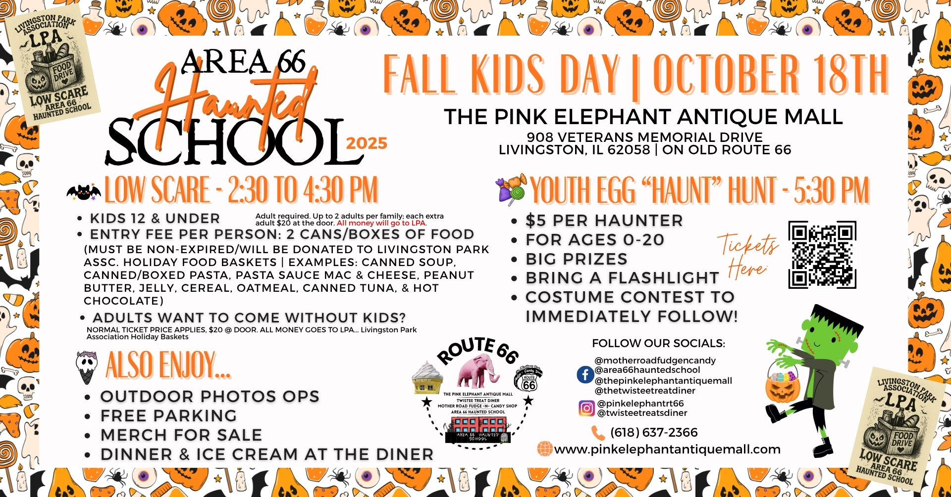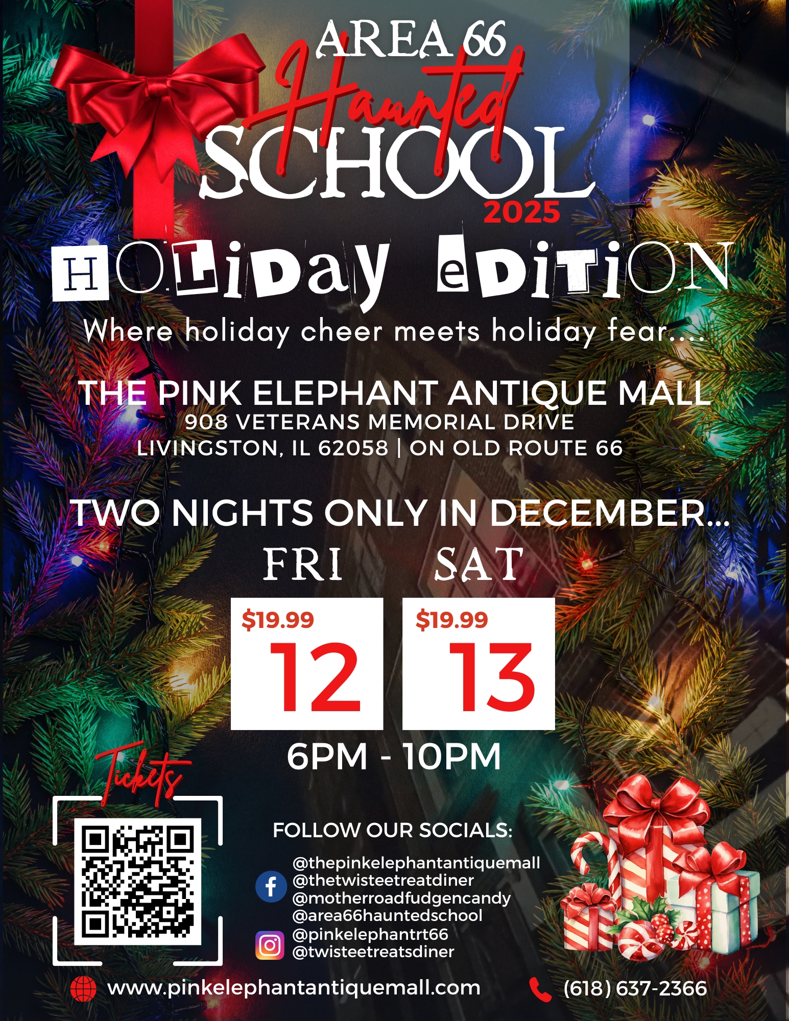 Howdy Y’all! We’re Tonia & Wayne Pickerill, proud owners of The Pink Elephant Antique Mall on Historic Route 66 in Livingston IL. This business has been a part of Livingston, IL since 2005. Our store is housed in the old Livingston IL high school, built in 1929. Today, it is a 30,000 square foot antique shopping mall, surrounded by historic fiberglass giants. The Pink Elephant is a favorite stop for those traveling Old Route 66. The mall has welcomed guests from all over the world, a map in the diner allows guests to place a pin for their place of origin. At Pink Elephant Antique Mall, we are passionate about supporting local vendors and offering a wide variety of antiques and items that appeal to all kinds of shoppers. The mall has everything from antique furniture, jewelry, collectibles, glassware, memorabilia, to candles, home goods and home decor. The mall also has two retro shops The Mother Road Fudge Factory and Candy Shop and The Twistee Treats Diner. The Mother Road Fudge Factory and Candy Shop is a 1950’s themed candy store that sells homemade fudge that is made on sight in a variety of flavors, caramelized roasted nuts made on sight, vintage candies, bulk candy, bulk salt water taffy, chocolates and Route 66 souvenirs. The Twistee Treats Diner is a kitschy 1950’s themed diner. The diner is in an original Twistee Treats ice cream cone shaped building with the dining area decked out in a hot pink tile floor. The Blues Brothers overlook the dining area and the jukebox. The diner serves a full menu for lunch and dinner including their burgers that are made with fresh local beef that is never frozen. The ice cream is amazing including soft serve, hand scooped and a large selection of specialties. The Pink Elephant is located right off of interstate I-55 40 minutes from St Louis, MO and less than an hour from Springfield IL. Come out to The Pink Elephant Antique Mall if you are looking for a memorable adventure. You will be glad you did. You can find us at 908 Veterans Memorial Dr in Livingston, IL 62058, or give us a call at (618) 637-2366. We look forward to welcoming you to our store!